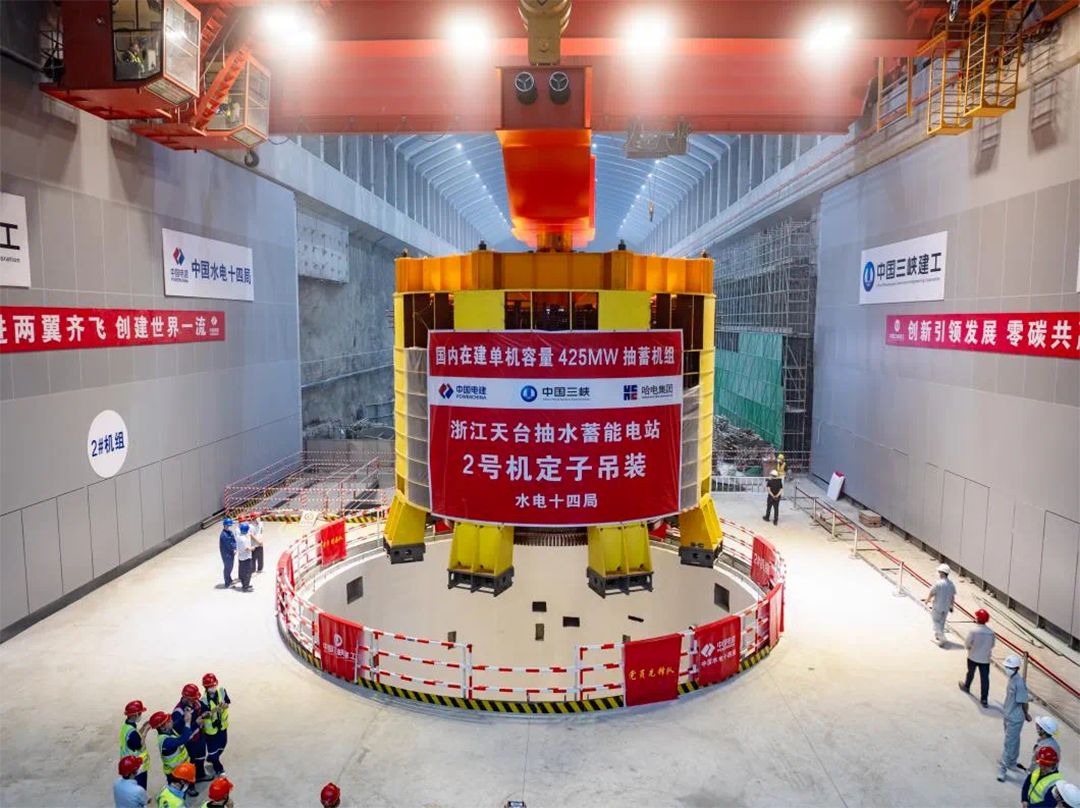 世界最高水頭抽蓄電站——浙江天臺抽水蓄能電站2號機組定子就位工作,巨力索具為其定制了配置八組起吊桿的定子吊具,確保其能夠承受巨大拉力和沖擊力。